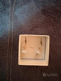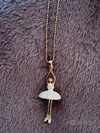 Bellissimo set composto da collana + orecchini a forma di ballerina, color oro con gonna decorata da strass luminosi.