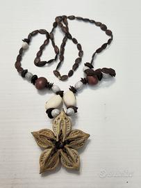 Vari tipi di semi di diversa dimensione e colore formano la catena lunga circa 72 cm (se stesa ) che termina con un fiore di circa 5,5 cm a cinque petali beige/marroni intagliati in gusci.