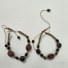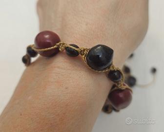 - i due braccialetti sono formati anch'essi da materiali naturali con semi e cordino cerato regolabile beige/marrone chiaro.