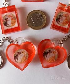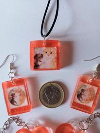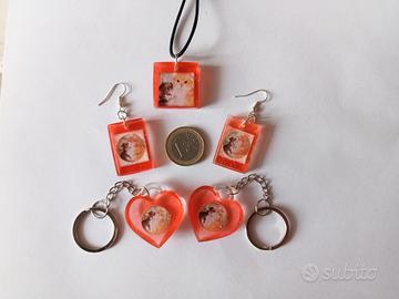 Set collana, orecchini+ 2 portachiavi a forma di cuore. Tutti sono decorati con l'immagine di due adorabili gattini.