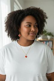 Descrizione: Un incantevole trio per un look romantico e raffinato: questo set include una collana dorata con pendente a cuore rosso recante la scritta “LOVE”, un paio di orecchini con aggancio a monachella e dettagli stellati, e un bracciale coordinato con lo stesso charm. Perfetto da regalare o da indossare per aggiungere un tocco di eleganza e sentimento a qualsiasi outfit.
