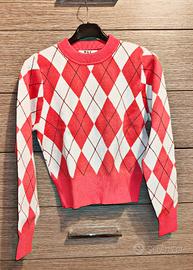 Il maglioncino cropped di colore corallo e bianco, è caratterizzato da un motivo a rombi. Il design è sportivo e giocoso, con maniche lunghe che si adattano perfettamente al corpo.