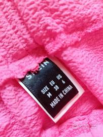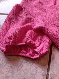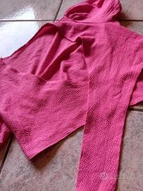 Bellissimo completo estivo composto da un top corto e pantaloni a palazzo. Entrambi i capi sono di un colore rosa acceso e presentano una texture leggermente ruvida.