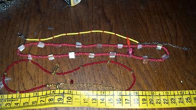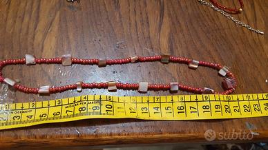 - collana in perline di vetro, elementi in madreperla e ciondolo in vetro montati su nylon elastico;