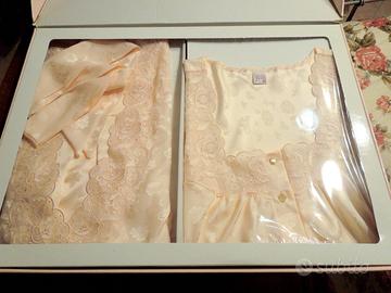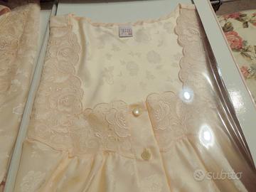 Il set si compone di elegante vestaglia piu' camicia da notte abbinata tessuto lucido e liscio al tatto, leggero, delicato sulla pelle e confortevole. Taglia 46 .IL SET NON E' MAI STATO USATO ! ricevuto come regalo di nozze non gradito