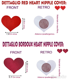 due coppie nipple cover heart,di colore e dimensioni diverse,ma entrambi coprenti,taglia unica,una coppia Red Heart,e una coppia Bordoux Heart confezionati separatamente.