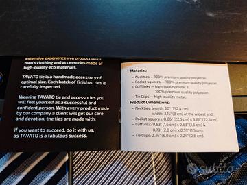 Vendo splendido set elegante e di classe cravatte da uomo Tavato Premium da 18 pezzi. Il set include cravatta, fazzoletti da taschino, fermacravatta e gemelli, tutti realizzati con un'elegante fantasia all-over nei toni del blu scuro e chiaro, grigio e argento.