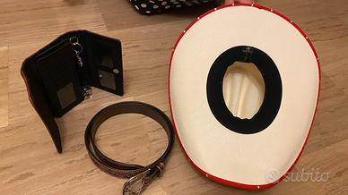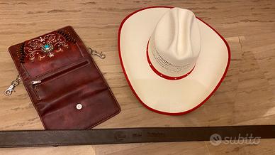 Nuovo set da ballo country, composto da un cappello tg 56(vedi foto), una cintura vera pelle lunga 1 metro(vedi foto) ed un borsello non in pelle, con attacco cintura, sempre da accompagnare il ballo. Preferibile la vendita tutta insieme. Tutto nuovo. Originale acquisto presso scuola di ballo.