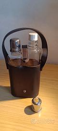 vendo set viaggio vintage, custodia in pelle color marrone, interno due bottigliette in vetro con tappo e chiusura in metallo, porta liquore da caccia x giornate fredde. Luigi