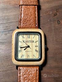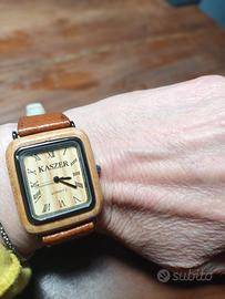2) Orologio " Kaszer" vintage con funzionamento a pila, quadrante in legno, cassa in metallo e cinturino in pelle. Indossato poco, in ottime condizioni. Piccolissimi punti di scoloritura del legno.