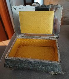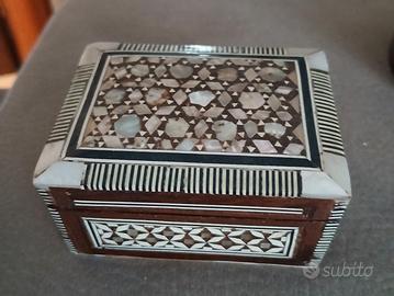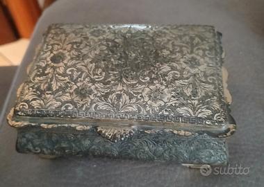 set di 3 portagioie : 1 scatolina in legno dipinta a mano 1scatolina con decorazioni a mosaico 1 di metallo argentato