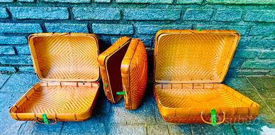 Set di valigie intrecciate in bambù anni 70 in ottime condizioni. Dimensioni 45x35 40x30 37x27’