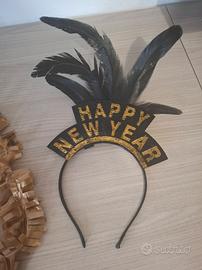 Comprende un elegante cerchietto “Happy New Year” con piume nere e due ghirlande dorate super luminose.
