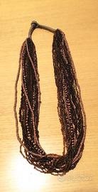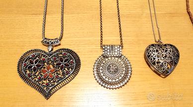 -3 catene lunghe con ciondoli (due cuori in metallo color argento e un tondo dorato in stile etnico);
