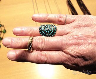 - 3 anelli in metallo, color oro, color argento sottilissimo e color bronzo con decorazioni azzurre.