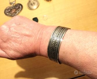 - un bracciale rigido in metallo color argento, stile "schiava" ;