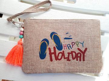 HAPPY HOLIDAY: fatto di tela naturale e foderato, nappina fluo e perle in legno decorative, laccio per polso, simpatico, estivo, fresco, colorato. 21x15 cm