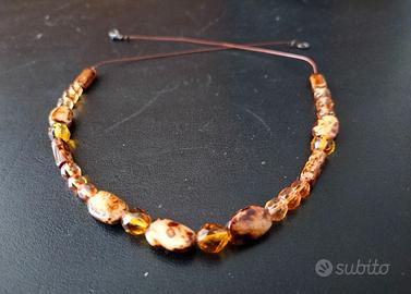 Set di due collane con un contenitore porta-gioie. Collana in doppia fila, lunga con perle sfaccettate in prezioso granato e con gancio in argento. Collana corta con perle più grandi al centro e con alcuni piccoli inserimenti in alambra. Contenitore porta-gioie incluso (ma non è parte di questa quotazione, ma omaggiato) in decorazione in rilievo ed al cui interno presenta segni di usura, come da foto. Lo stato indicato "come nuovo" è riferito alle sole due collane.