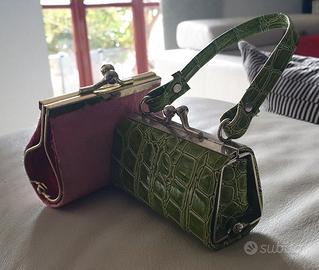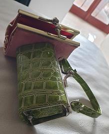 Set di due eleganti borsettine vintage, perfette come portamonete o porta trucchi. - Una borsetta è verde con finitura effetto coccodrillo. - L'altra borsetta è rosa con un motivo floreale. - Entrambe presentano una chiusura a scatto metallica.