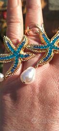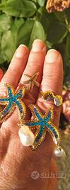 Set di gioielli marini. due anelli a forma di stelle marine dorate e conchiglie. Orecchini a forma di stella marina con strass blu e lilla e pendenti di perle. Gli anelli sono regolabili. Ideale per rilassarsi sulla costa e per sessioni fotografiche. Crea un'atmosfera festosa e spensierata!