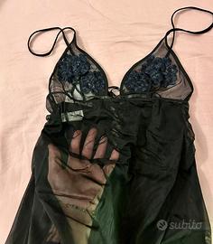 Set di lingerie babydoll e perizoma nero con dettagli in pizzo blu scuro Ritratti, linea Cezanne. Spalline strette per un look delicato Senza coppe e senza ferretti per una vestibilità confortevole Consigliato lavaggio delicato a mano o a secco a causa della delicatezza del tessuto e dei ricami. COMPOSIZIONE: 55% poliammide, 35% viscosa, 10% elastam COLORE : NERO Taglia 2 USA 34-S Prezzo al negozio 159 euro