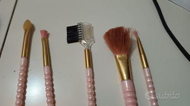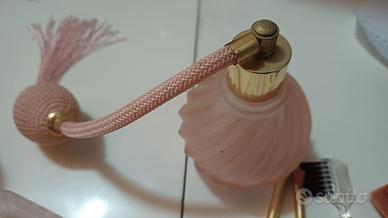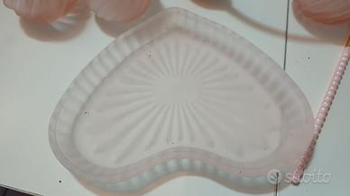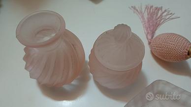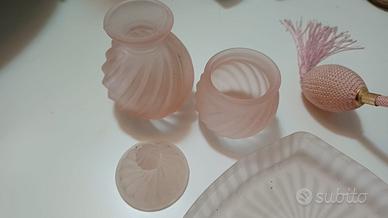 Set di oggetti per cosmetici in vetro di colore rosa. Due cofanetti di vetro e una bomboletta per profumo, 45 piccoli pennellini e piccolo pettine per ciglia con spazzolina. Dimensioni del cuore 15,5 x 13 cm. Altezze dei cofanetti 8 e 9 cm e lunghezze dei pennellini 15-16 cm. Ritiro a mano.