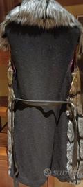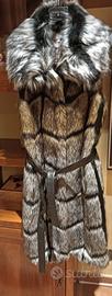 Taglia 42, colore pelliccia grigio, com sfumature bianche e beige. Fodera interna, sulle spalle con logo, e il resto di raso bordeaux. Il dietro del cappotto è di tessuto nero.