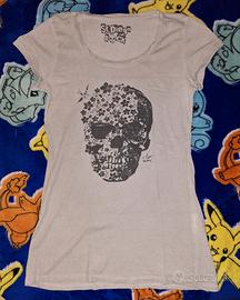 Set di due magliette da donna. Con difetti. - Una maglietta beige con dettagli sfrangiati sulle maniche e macchie sul davanti. Presenta due buchini sulla manica destra. - Una maglietta grigia con stampa teschio floreale e scritta San Diego Rock. Presenta un buchini sul fondo.