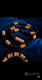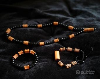 Set artigianale proveniente dal Senegal, caratterizzato da uno stile etnico unico e ricercato. Il set è composto da una collana e due bracciali coordinati, realizzati con perline nere lucide e inserti color ocra decorati con motivi geometrici tradizionali.