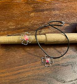 Collana: Ciondolo a forma di fiore stilizzato con pietra centrale dalle sfumature rosa. Cordino nero in caucciù.