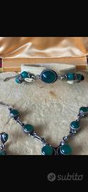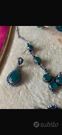 Bellissimo set di gioielli composto da collana, braccialetto, anello e orecchini. I gioielli sono in argento e giada. Sono in ottime condizioni e la scatola non e compresa.