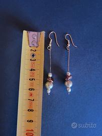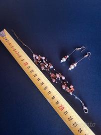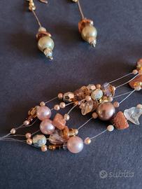 Set di gioielli composto da orecchini pendenti e un braccialetto in stile multistrato con perline e cristalli nei toni del color bronzo e oro.