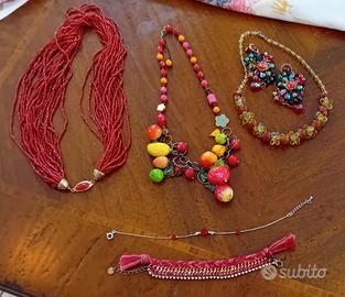 Gioielli di bigiotteria vintage/anni 90 ben tenuti, divisi per tonalità; braccialetti, orecchini e collane, una cavigliera e un gancio per borsetta da tavolo.
