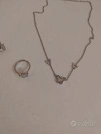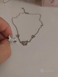 Vendo per inutilizzo questo set meraviglioso, collana farfalle con farfalla trasparente e pietrine all'interno che si muovono e anello con farfalla trasparente come la collana. Orecchini farfalla mai usati con brillantino centrale. Separati costano molto di più.