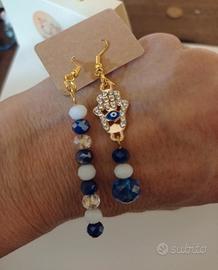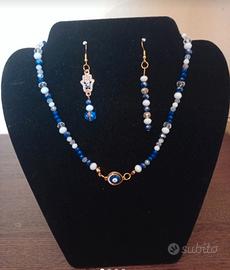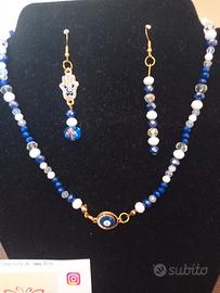 set composto da una collana e un paio di orecchini in acciaio dorato pendenti. realizzato in pietre dure blu simili e perline bianche con ciondolo Centrale a forma di occhio Greco mentre gli orecchini come ciondolo a la mano di Fatima.. Stupendo! Portafortuna 😉