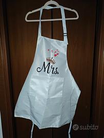 Il grembiule lui é nero con la scritta "Mr." e cuori rossi mentre quello per lei é bianco con la scritta "Mrs." e cuori rossi.