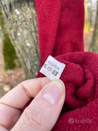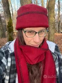 Set invernale composto da cappello, sciarpa e guanti coordinati, colore bordeaux con cuciture decorative nere a vista.