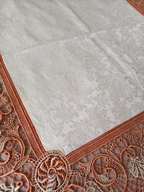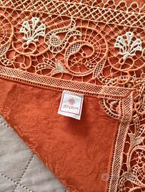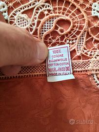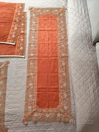 Elegante set coordinato originale ****, storica manifattura veneziana di biancheria di alta gamma. Composto da: 2 tappeti bagno cm 60×100 1 runner cm 130×45 1 centro tavola cm 70×70 (misura inclusi angoli decorativi) Materiale: 100% cotone – Made in Italy Lavorazione con raffinati ricami e inserti in pizzo/macramè. ✔ Condizioni: pari al nuovo, usati pochissimo e solo in rare occasioni ✔ Nessun difetto, nessuna macchia ✔ Colore elegante arancio/terracotta con ricami chiari Set ideale per: arredo bagno di pregio tavola elegante / seconda casa amanti del tessile di qualità e Made in Italy Prodotto di fascia alta, difficilmente reperibile completo. 💰 Prezzo leggermente trattabile 📦 Spedizione accurata e tracciata
