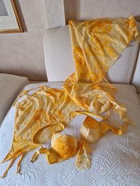 Set 3 pezzi composto da reggiseno, top e pareo, bellissima fantasia solare di rose in pizzo, indossato poche volte, comodo,pratico e versatile,
