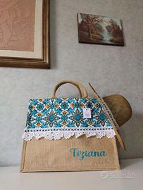 1 borsa in juta decorata con stoffa fantasia a piacere e nome su richiesta