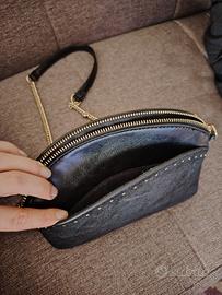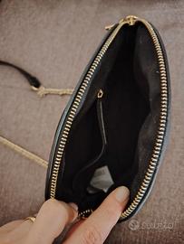 La mini bag, 23cm x 17cm circa, base 8 cm, presenta una tracolla a catenella non removibile dorata, lunga circa 110 cm; una tasca frontale senza chiusure e all'interno un taschino con zip.