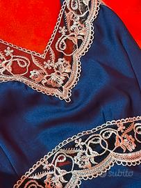 Set notte composto da vestaglia e babydoll in blu notte con inserti di pizzo color oro scuro. Tg.xl