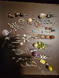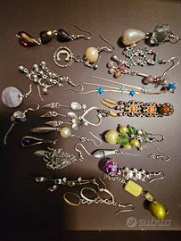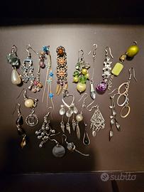 Collezione assortita di orecchini singoli, molti dei quali sono pezzi di bigiotteria vintagee artigianale. suggerisce che alcuni La selezione include diversi stili: Orecchini pendenti singoli e chandelier:Molti modelli presentano pietre colorate (come verde e arancione), perle e lavorazioni metalliche intricate in tonalità argento. Materiali vari:Si distinguono elementi in metallo (probabilmente leghe argentate), vetro, resina e possibili pietre dure. Vendo tutti in blocco a un ottimo prezzo. Le foto sono parte integrante della descrizione.