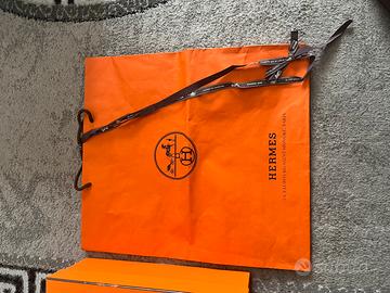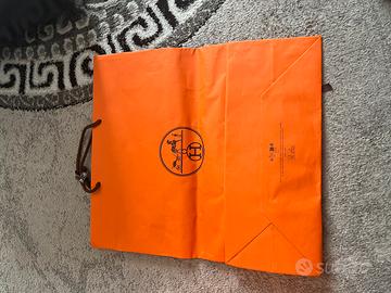 Vendo set di packaging originale Hermès Paris, perfetto per valorizzare un regalo, per esposizione o per chi desidera completare un set da collezione. Tutto il materiale è autentico e conservato con estrema cura. Il set include: • Scatola Arancione Iconica: Struttura rigida e robusta con logo centrale. Ideale per contenere piccola pelletteria, accessori o sciarpe (verificare le misure sotto). • Sacchetto (Shopping Bag): In carta spessa testurizzata con manici in corda marrone e logo "24, Faubourg Saint-Honoré, Paris". • Nastro (Bolduc): Il classico nastro marrone logato Hermès, incluso per completare il pacchetto regalo perfetto. Dettagli e Condizioni: • Stato: Ottimo stato estetico. La scatola è integra e senza angoli ammaccati; il sacchetto presenta solo le naturali pieghe di utilizzo ma è pulito e senza strappi. • Colore: Arancione Hermès originale con finiture marrone cioccolato. • Dimensioni: 36cm/22 cm
