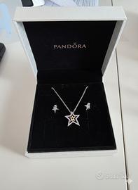 Vendo splendido set coordinato firmato Pandora, perfetto come idea regalo o per illuminare il proprio look quotidiano. Il design a stella è un classico intramontabile del brand, elegante e luminoso. 💎 Dettagli del set: Collana: Pendente a forma di doppia stella. La stella esterna è impreziosita da pavé di pietre di zirconia cubica, mentre quella interna ha una finitura liscia (probabilmente in tonalità oro rosa/metallo a contrasto) con un piccolo dettaglio a cuore al centro. Orecchini: Punti luce a lobo a forma di stella coordinati, anch'essi con pietre incastonate per la massima lucentezza. Materiale: Argento Sterling 925 di alta qualità . Condizioni: nuovo mai indossato Cosa include l'acquisto: Pendente e catenina originale. Coppia di orecchini a lobo. Confezione originale Pandora (scatola rigida bianca con interno in velluto nero) inclusa, ideale per un regalo.