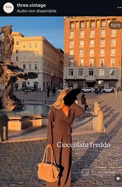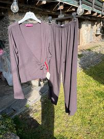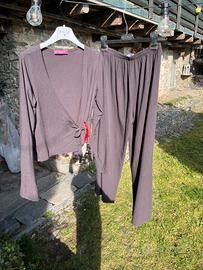 Completo Gabry di three vintage, 100% lana vergine (wool), brand italiano di vestiti di produzione sartoriale che utilizza solo tessuti naturali, color cioccolato freddo, maglia Gabry con incrocio frontale taglia S, pantalone a palazzo Gabry taglia M con elastico in vita, valore acquisto 100€, super occasione, tessuti che durano nel tempo, difficile trovare vestiti 100% lana, valuto offerte ragionevoli, vendibili singolarmente :) tiene molto caldo