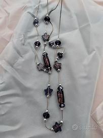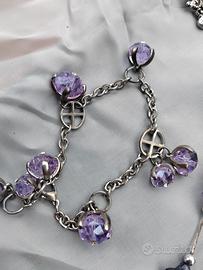 Set composto da collana lunga con perline viola , bracciale con charms viola e orecchini pendenti con brillantini viola incastonate.