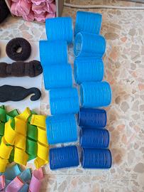 Set per acconciare i capelli in trecce, chignon, boccoli e capelli mossi. Bigodini morbidi, bigodini rigidi di due misure, bigodini lunghi di due misure, ciambelle per chignon (una molto grande, due medie, due piccole uguali), due pinze per dare volume, un accessorio per creare una treccia, uno per fare uno chignon, uno per capelli mossi.
