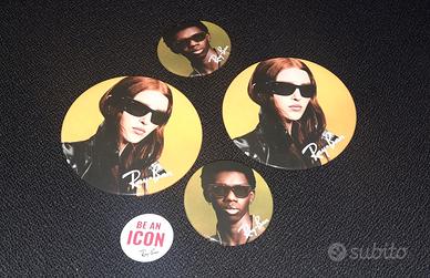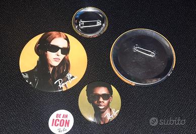 Le spille presentano grafiche ufficiali Ray-Ban con modelli che indossano occhiali iconici del brand. Oggetti promozionali autentici, difficili da trovare, perfetti anche come idea regalo.