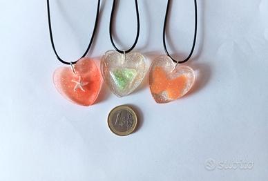 Set tre collane con ciondoli in resina a forma cuore, decorati all' interno con diverse forme: triangolo brillante, stella marina e farfalla). I lacci delle collane sono regolabili, la dimensione dei ciondoli è mostrata nella foto in cui sono stati messi accanto ad una moneta da 1 euro.